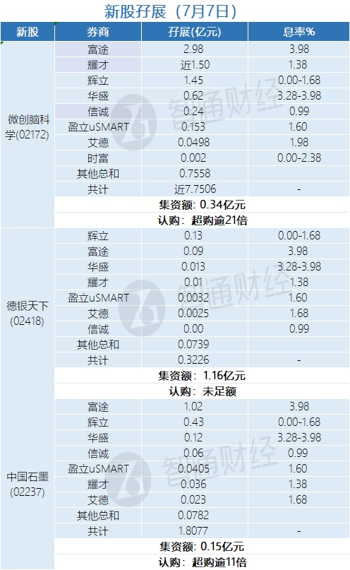 智通财经APP获悉,微创脑科学(02172)、德银天下(02418)、中国石墨(02237)正在招股中。截至7月7日,富途、辉立、华盛、耀才证券等合计为微创脑科学、德银天下、中国石墨分别借出孖展近7.7506亿、0.3226亿、1.8077亿港元。微创脑科学超购逾21倍、中国石墨超购逾11倍,德银天下认购未足额。