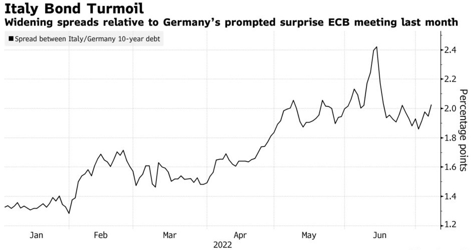 以拉加德为首的欧洲央行官员在6月份的政策会议上表示,他们将在7月份开始加息。随后,在意大利债券收益率飙升后,官员们被迫承诺附带一项危机工具,以遏制对较弱欧元成员国的影响。