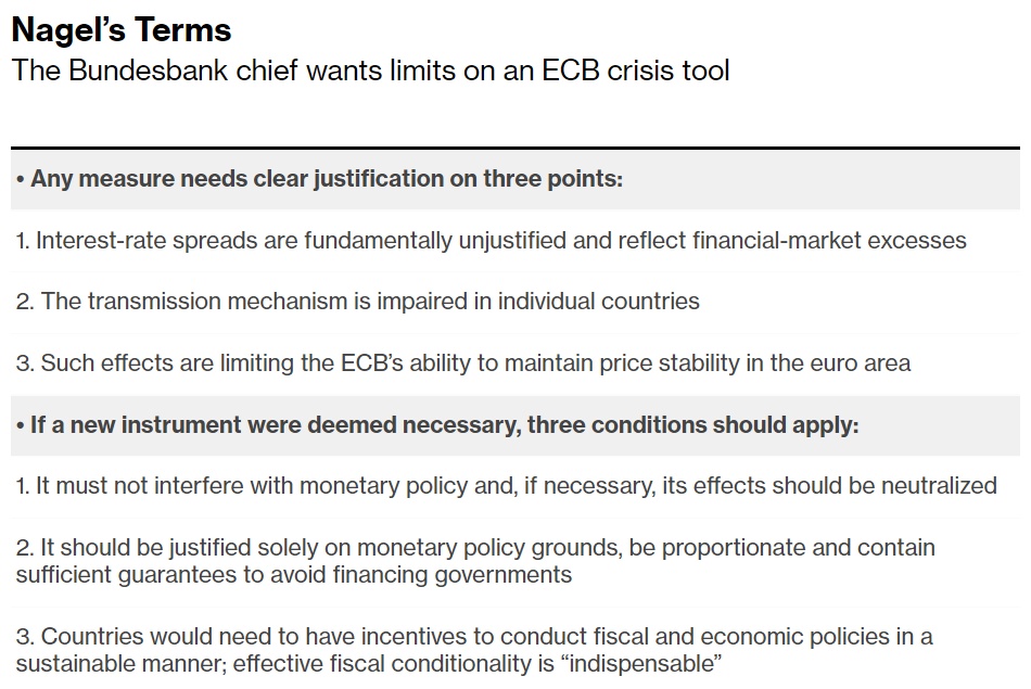 不过,德国央行行长Joachim Nagel打破了近期闭门磋商的情况,Nagel公开警告称,要决定欧元区国家之间借贷成本的差异是否合理“几乎是不可能的”。他表示,如果欧元区各国政府依赖欧洲央行的支持,“那将是致命的”。