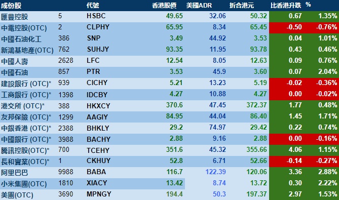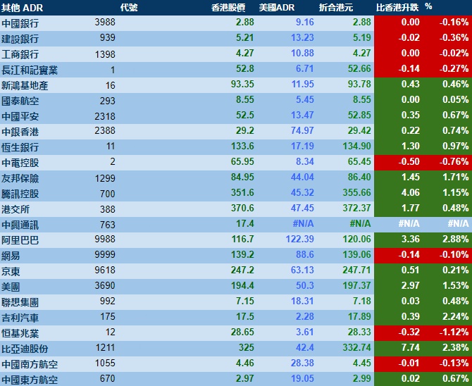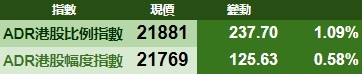 智通财经APP获悉,周四美股三大指数全线上涨,港股ADR指数上涨,按比例计算,收报21881点,较香港收市涨237.70点或1.09%。