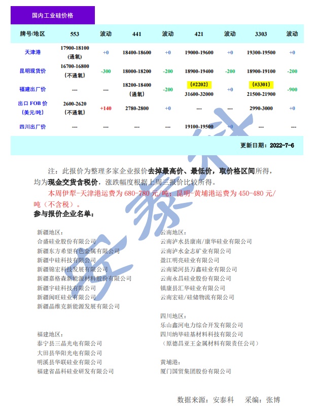 据调研统计6月份工业硅产量共计28.27万吨,环比增加10.95%,同比增加35.6%。丰水期来临,德宏盈江地区企业陆续复工,7月国内硅工业硅供应有望环比增加6.1%。国内供应增加的情况下,需求也随之增加。虽然近期下游铝合金行情偏弱且处于终端消费淡季,市场采购滞缓,压价较严重,供强需弱局面持续,但后续随着疫情影响消散,消费恢复回暖,铝合金对工业硅需求增加;有机硅、多晶硅新建产能陆续释放,相关企业对工业硅需求持续增加,叠加海外预计7月份工业硅需求有望环比增加12.1%,后市工业硅市场呈现供需双旺局面。同时,近期原材料和物价价格高于往年,导致成本在16000元/吨左右,上下游双方将继续博弈,短期内工业硅价格持稳运行为主。