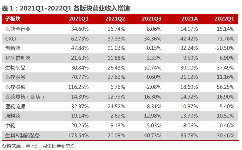 从今年一季度收入看,CXO行业依然保持着高速增长,营收增速居医药子板块第一,这得益于CXO内生订单的增加,以及辉瑞新冠订单的逐步兑现。预计CXO板块在Q2中仍能保持高速增长,在医药行业中表现突出。