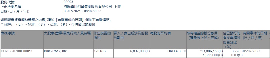 智通财经APP获悉,香港联交所最新资料显示,7月5日,贝莱德减持洛阳钼业(03993)683.7万股,每股作价4.383港元,总金额约为2996.66万港元。减持后最新持股数目约为3.54亿股,最新持股比例为8.99%。