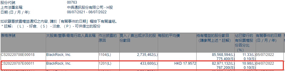 智通财经APP获悉,香港联交所最新资料显示,7月4日,贝莱德减持中兴通讯(00763)43.36万股,每股作价17.9572港元,总金额约为778.62万港元。减持后最新持股数目约为8297.11万股,最新持股比例为10.98%。
