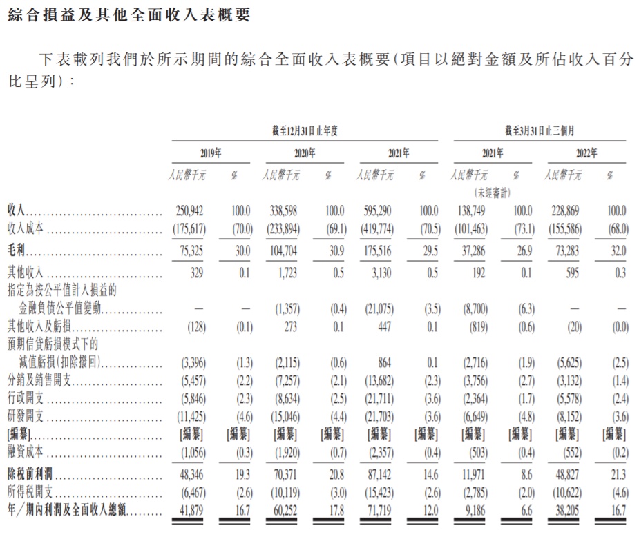 财务方面,截至2019-2021年12月31日止年度,公司收入分别约2.51亿元, 3.39亿元及5.95亿元(人民币,下同),毛利分别约为7532.5万元,1.05亿元及1.76亿元;净利分别约为4187.9万元,6025.2万元及7171.9万元。