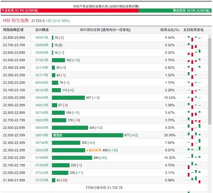 智通财经APP获悉,截至7月8日,恒指最新的牛熊街货比例为65:35。