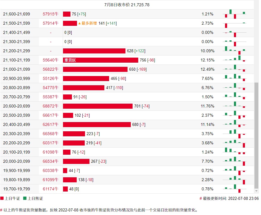法兴恒指牛熊证街货分布图中的数据显示,熊证街货重货区在22500-22599区间,该区间最新熊证数量为877张,较上一交易日增加62张;最多新增在22300-22399区间,该区间最新熊证数量为409张,较上一交易日增加130张。