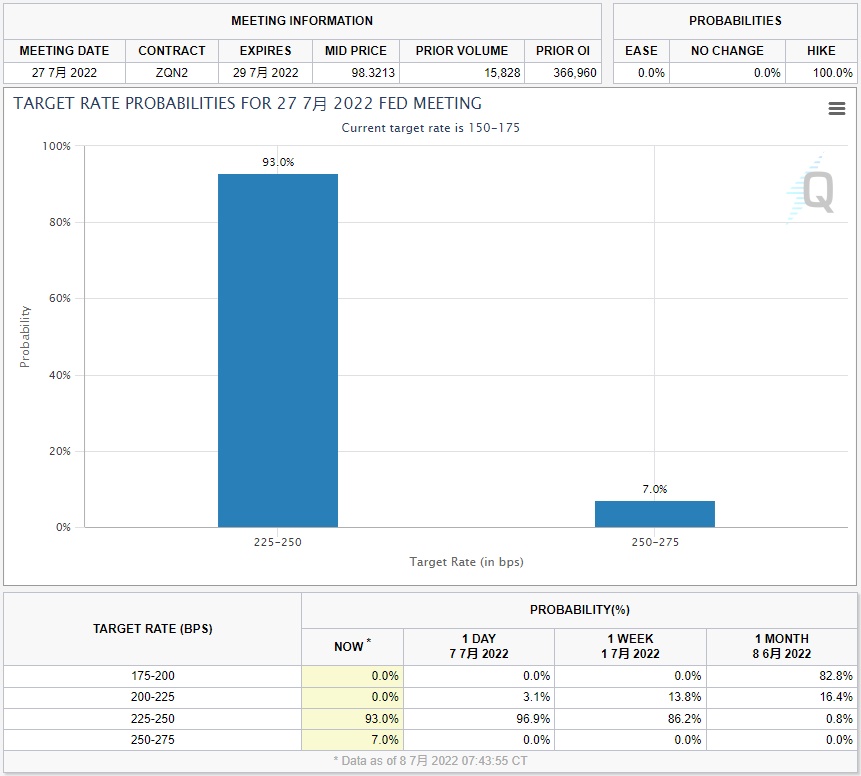 根据芝加哥商品交易所集团(CME)的FedWatch工具的最新数据,截至发稿,美联储到7月份加息75个基点的概率已升至93.0%,高于一周前的86.2%。