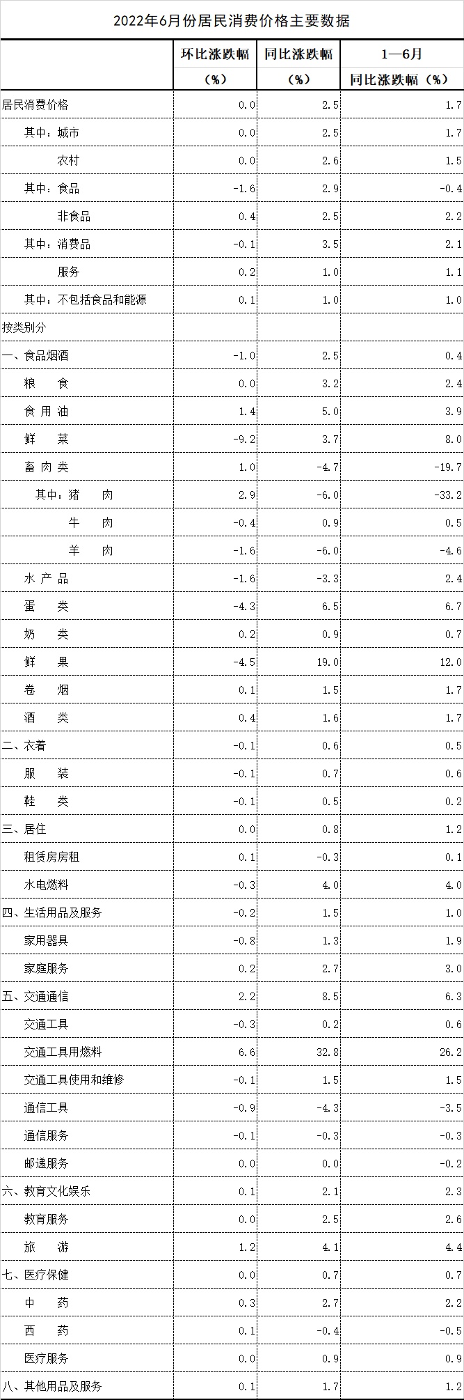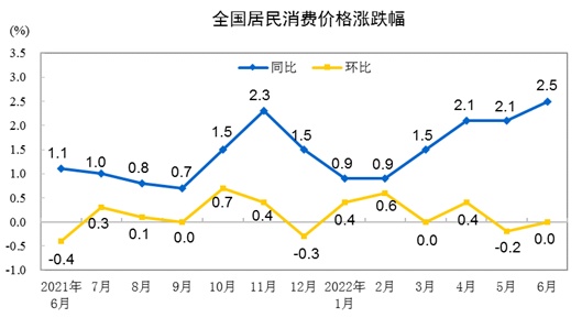 智通财经APP获悉,2022年6月份,全国居民消费价格同比上涨2.5%。其中,城市上涨2.5%,农村上涨2.6%;食品价格上涨2.9%,非食品价格上涨2.5%;消费品价格上涨3.5%,服务价格上涨1.0%。1—6月平均,全国居民消费价格比上年同期上涨1.7%。