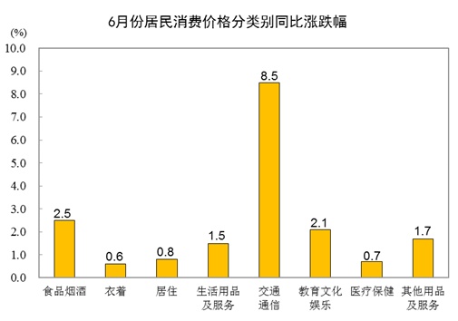 其他七大类价格同比均上涨。其中,交通通信、教育文化娱乐、其他用品及服务价格分别上涨8.5%、2.1%和1.7%,生活用品及服务、居住价格分别上涨1.5%和0.8%,医疗保健、衣着价格分别上涨0.7%和0.6%。