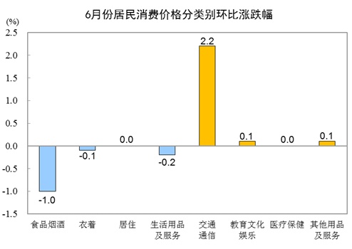 6月份,全国居民消费价格环比持平。其中,城市持平,农村持平;食品价格下降1.6%,非食品价格上涨0.4%;消费品价格下降0.1%,服务价格上涨0.2%。