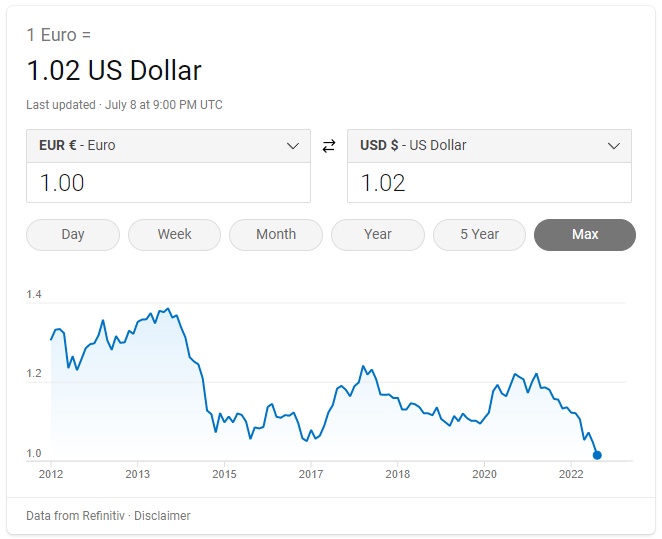 智通财经APP获悉,2008年金融危机期间,美国经济陷入衰退,欧元兑美元汇率为1.6。而如今,俄乌冲突带来的紧张地缘政治局势以及欧洲央行迟迟不加息,欧元兑美元汇率已逼近平价。截至发稿,欧元兑美元汇率为1.02。