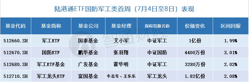 值得一提的是,在首周(7月4日至8日)30只收涨的陆股通ETF中,上述4只国防军工类ETF均实现上涨,涨幅分别为1.99%、3.01%、2.02%、2.08%,份额分别增加1亿份、0.44亿份、0.33亿份、1.82亿份。