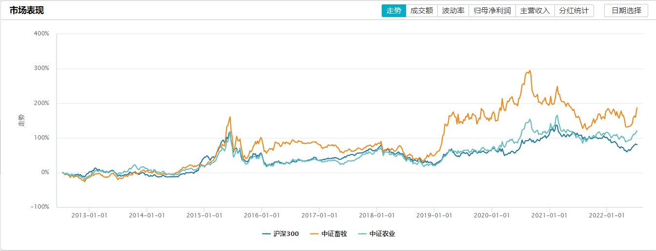 中证畜牧指数今日拉升上涨1.64%,4月27日来涨幅达24.45%。值得注意的是,尽管今年市场整体大幅回撤,该指数年内仍能保持正增长。2015年来,该指数持续跑赢中证农业指数和沪深300。