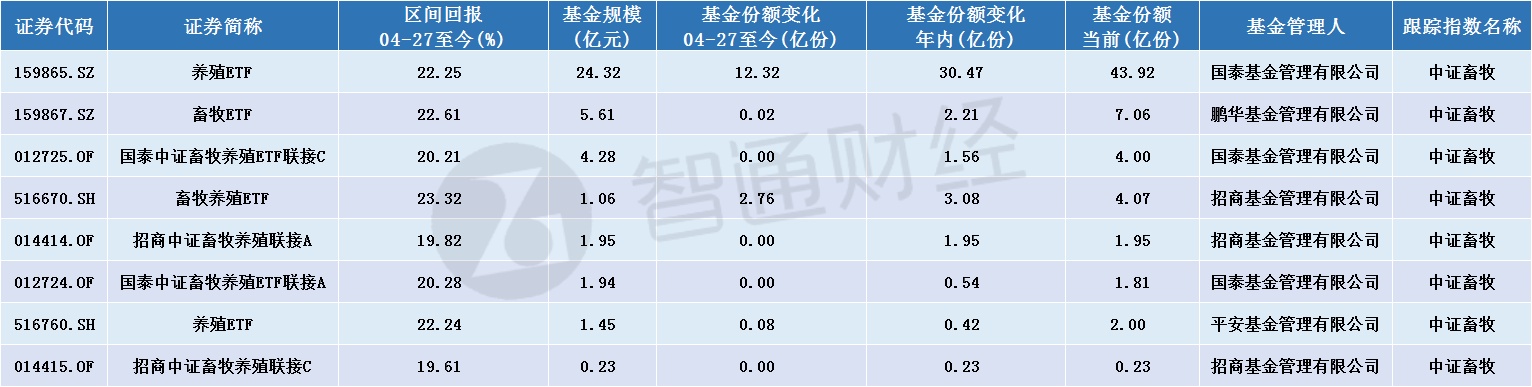 其中,养殖ETF(159865.SZ)作为追踪中证畜牧指数规模最大的基金,4月27日以来涨幅达22.25%,份额增加12.32亿份。该基金近两个月净流入额达10.89亿,净流率为43.92%。