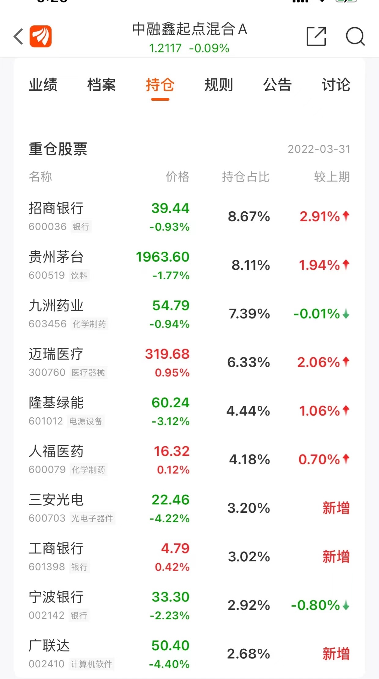 而在中融鑫起点混合(001413.OF)重仓股方面,前十大中除了3只银行股外,其余均来自不同行业,如贵州茅台(600519.SH)、九洲药业(603456.SH)、隆基绿能(601012.SH)、广联达(002410.SZ)等。