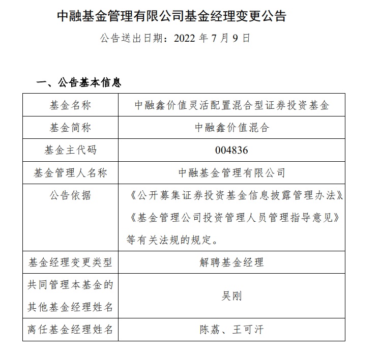 智通财经APP获悉,中融基金王可汗一天内卸任两只基金基金经理。7月9日,中融鑫价值混合(004836.OF)发布公告,陈荔、王可汗不再担任该基金基金经理,变更后该基金基金经理为吴刚。与此同时,中融鑫起点混合(001413.OF)也发布公告称,王可汗不再担任该基金基金经理,由陈荔接任。