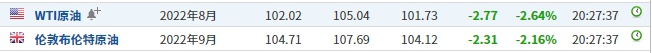3. 截至发稿,WTI原油跌2.64%,报102.02美元/桶。布伦特原油跌2.16%,报104.71美元/桶。