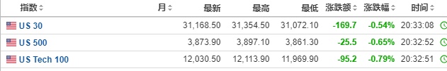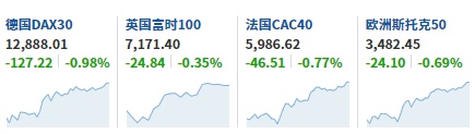 2. 截至发稿,德国DAX指数跌0.98%,英国富时100指数跌0.35%,法国CAC40指数跌0.77%,欧洲斯托克50指数跌0.69%。