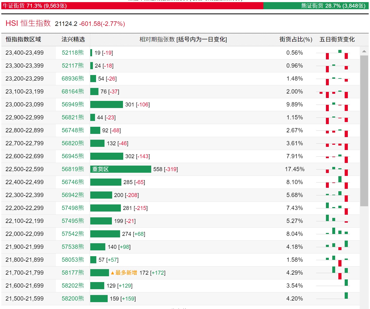 法兴恒指牛熊证街货分布图中的数据显示,熊证街货重货区在22500-22599区间,该区间最新熊证数量为558张,较上一交易日减少319张;最多新增在21700-21799区间,该区间最新熊证数量为172张,较上一交易日增加172张。