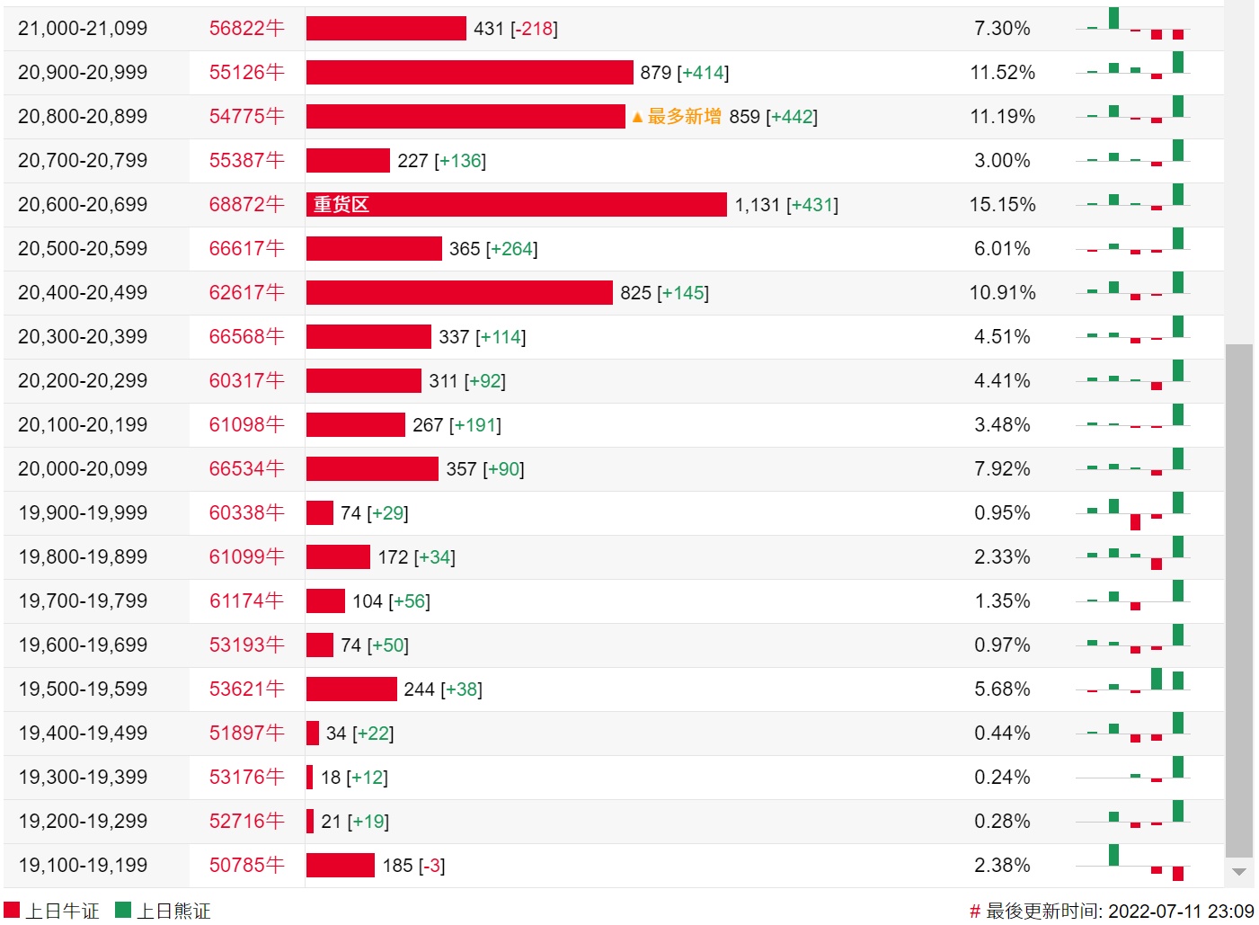 牛证街货重货区在20600-20699区间,该区间最新牛证数量为1131张,较上一交易日增加431张;最多新增在20800-20899区间,该区间最新牛证数量为859张,较上一交易日增加442张。