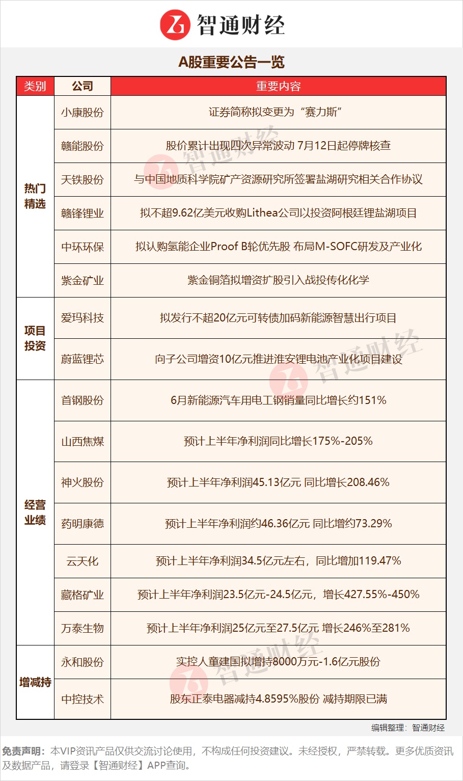 (1)江山股份(600389.SH)发预增,预计半年度净利润11.8亿元-12.4亿元,同比增长284.40%-303.94%:公司主营产品包括草甘膦、酰胺类除草剂、氯碱产品等。