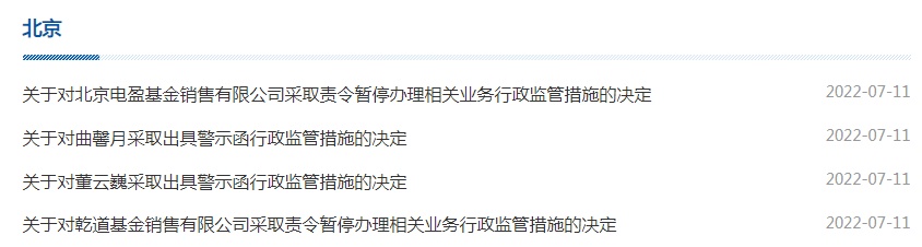 智通财经APP获悉,7月11日,北京证监局连发两道行政监管措施,责令乾道基金销售有限公司、北京电盈基金销售有限公司分别暂停办理相关业务3个月、12个月。两家公司总经理董云巍、曲馨月均被出示警示函。