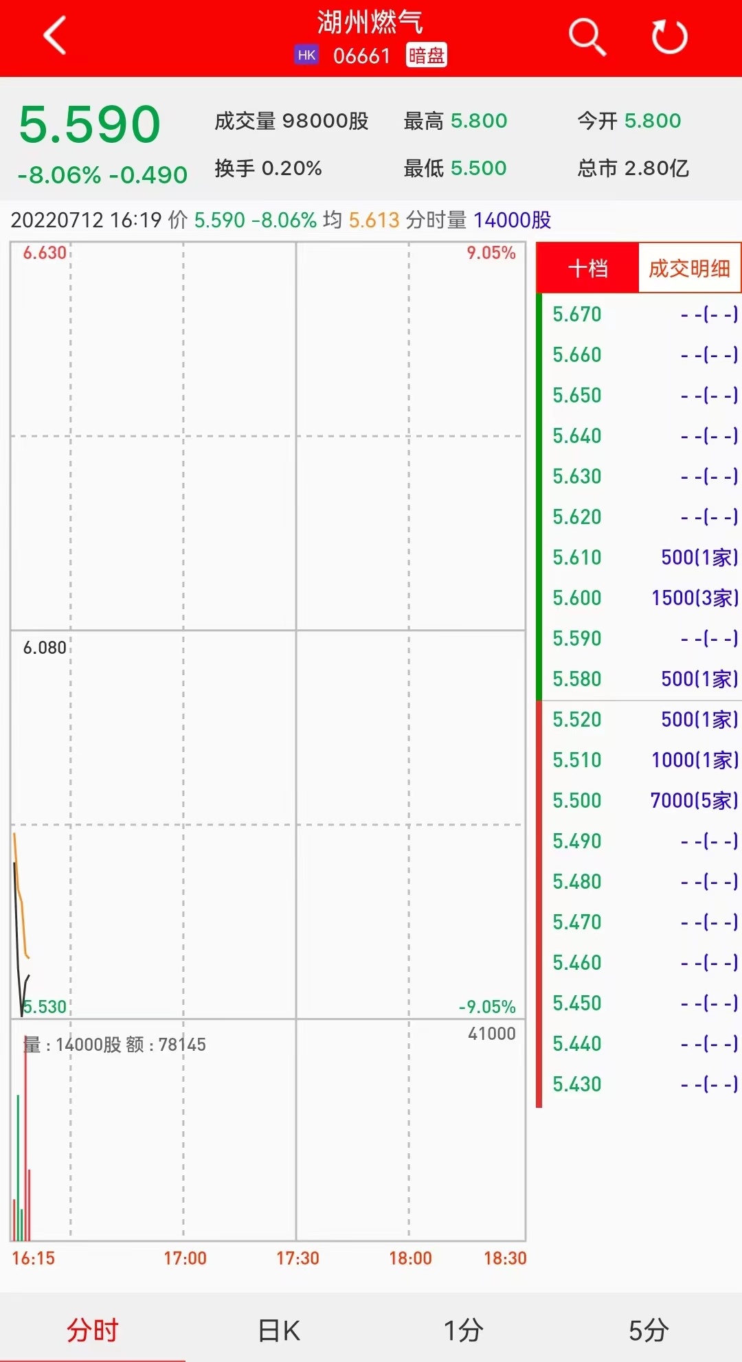 智通财经APP获悉,湖州燃气(06661)将于7月13日(星期三)在香港挂牌。截至发稿,利弗莫尔证券暗盘交易显示报价5.590港元,较招股价6.080港元跌8.06%。每手500股,不计手续费,每手亏245港元。