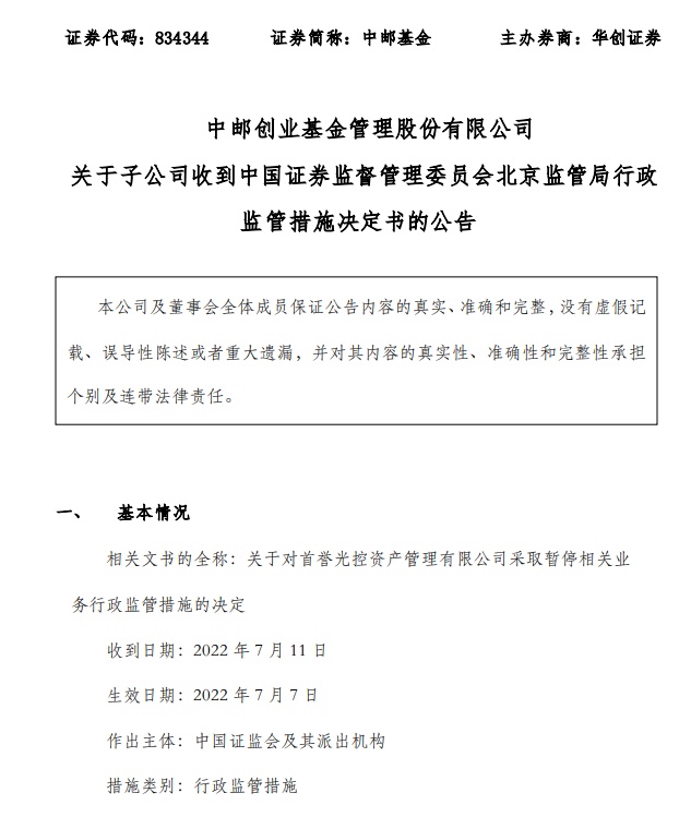 对此,中邮创业基金表示,将按监管要求督促首誉光控子公司即行整改、差缺补漏,进一步加强资产管理业务的内控管理,切实提升合规风控管理水平。