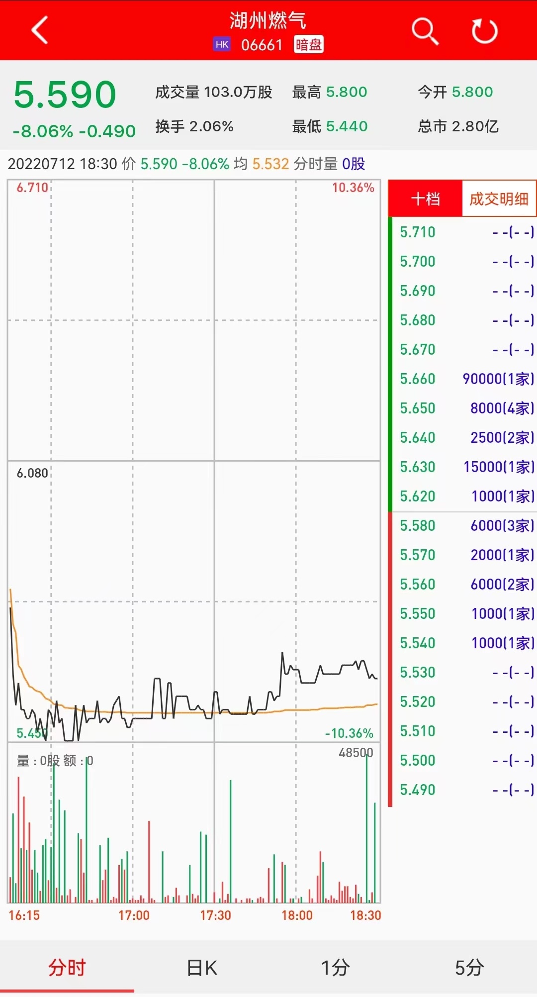 智通财经APP获悉,湖州燃气(06661)将于7月13(星期三)在香港挂牌。截至收盘,利弗莫尔证券暗盘交易显示报价5.59港元,较招股价6.08港元跌8.06%。每手500股,不计手续费,每手亏245港元。