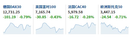 2. 截至发稿,德国DAX指数跌0.79%,英国富时100指数跌0.43%,法国CAC40指数跌0.28%,欧洲斯托克50指数跌0.71%。