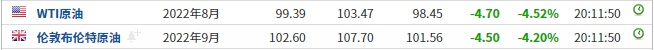 3. 截至发稿,WTI原油跌4.52%,报99.39美元/桶。布伦特原油跌4.20%,报102.60美元/桶。