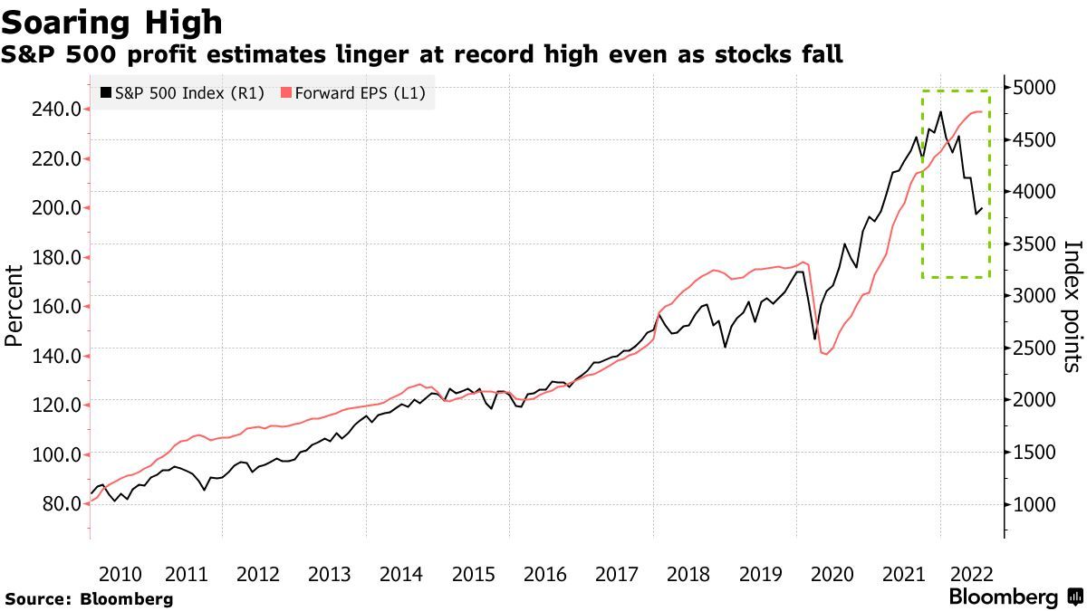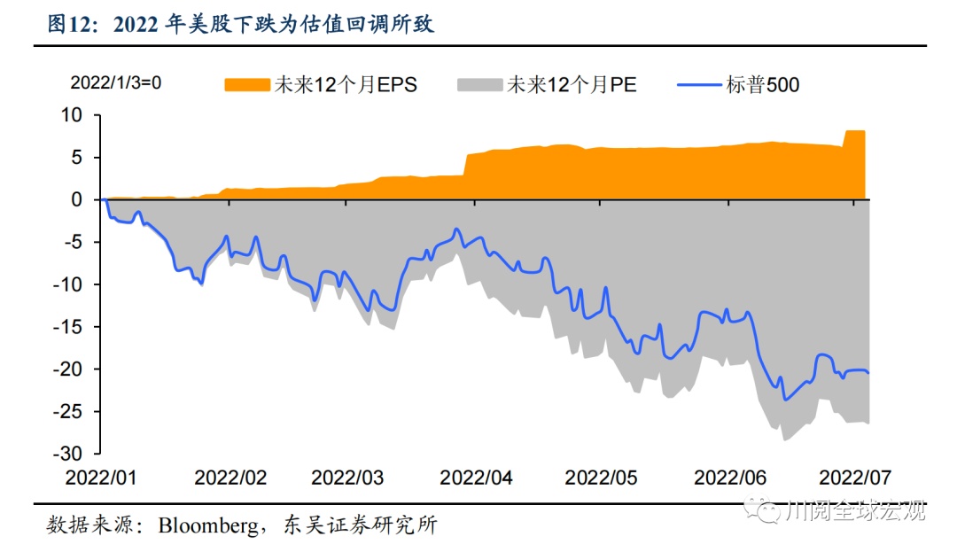 东吴证券在研究报告中称,美股这波熊市尚未体现对未来盈利预期的下降,仅是估值回调所致(如下图)。市场尚未对即将到来的衰退定价,因此东吴证券重申此前观点,即美股的调整尚未结束,并认为3100至3200之间可能是更加合理的底部位置。
