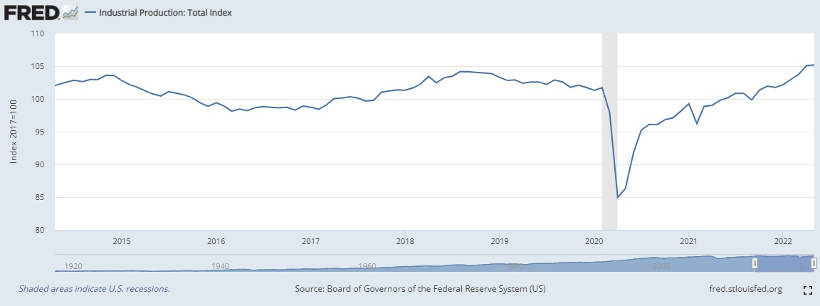 衡量美国整体工业水平的工业生产指数5月统计数据与4月几乎持平,增幅明显放缓,同样反映的是通胀重压之下投入端的成本压力陡增,以及市场需求放缓趋势。
