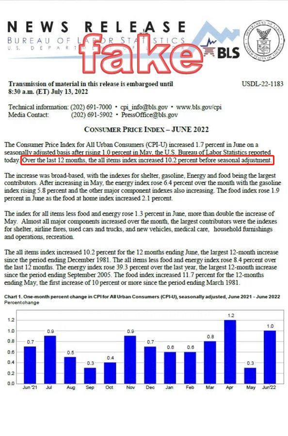 据悉,该假报告中表示,美国6月未季调消费者价格指数(CPI)同比增长10.2%。该假报告开始在社交媒体上流传之时,美股跌至盘中低点。