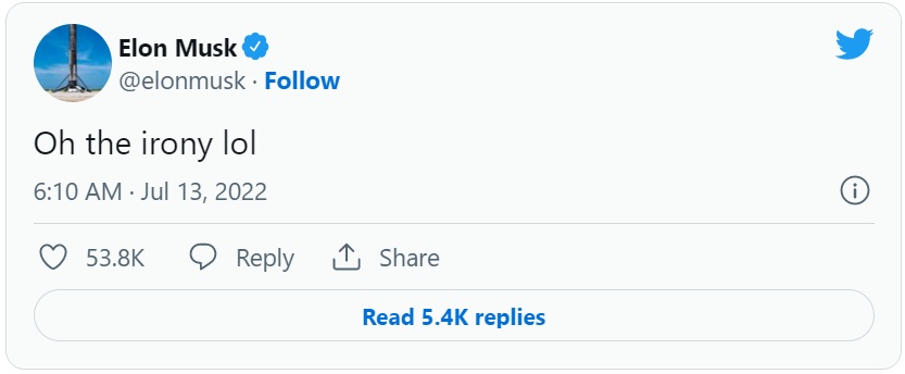 在推特周二提起诉讼后,马斯克在推特上写道:“哦,这太讽刺了,哈哈。”