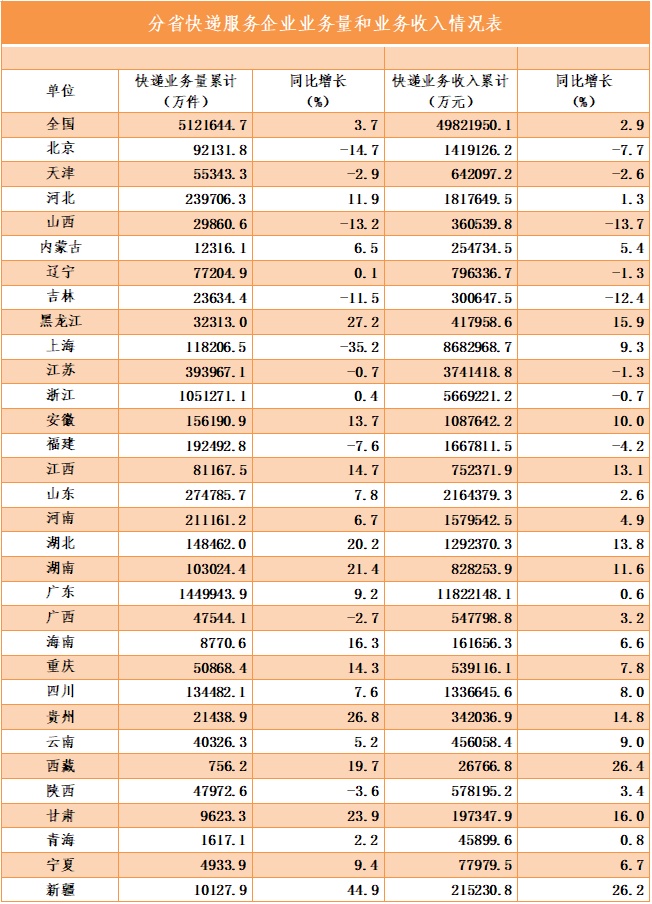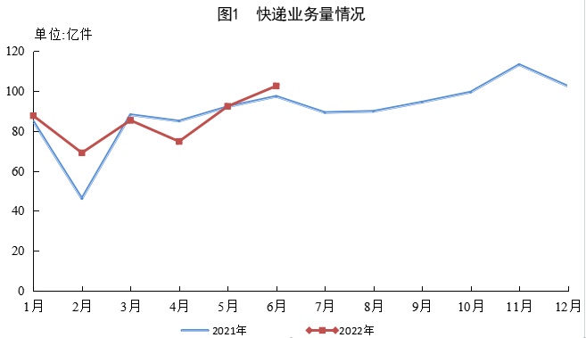 6月份,全国快递服务企业业务量完成102.6亿件,同比增长5.4%;业务收入完成976.7亿元,同比增长6.6%。