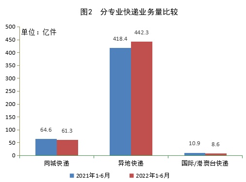 上半年,全国快递服务企业业务量累计完成512.2亿件,同比增长3.7%;业务收入累计完成4982.2亿元,同比增长2.9%。其中,同城业务量累计完成61.3亿件,同比下降5.1%;异地业务量累计完成442.3亿件,同比增长5.7%;国际/港澳台业务量累计完成8.6亿件,同比下降21.4%。