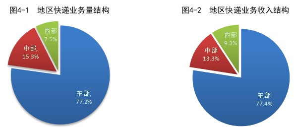 上半年,东、中、西部地区快递业务量比重分别为77.2%、15.3%和7.5%,业务收入比重分别为77.4%、13.3%和9.3%。与去年同期相比,东部地区快递业务量比重下降1.4个百分点,快递业务收入比重下降1.1个百分点;中部地区快递业务量比重上升1.1个百分点,快递业务收入比重上升0.6个百分点;西部地区快递业务量比重上升0.3个百分点,快递业务收入比重上升0.5个百分点。