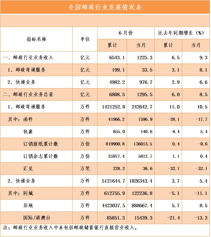 6月份,邮政服务业务总量完成179.9亿元,同比增长7.2%;邮政寄递服务业务量完成24.3亿件,同比增长10.5%;邮政寄递服务业务收入完成33.5亿元,同比增长8.1%。