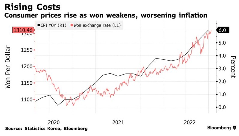 与此同时,随着美联储加速收紧货币政策,韩元也面临压力。今年以来,韩元在亚洲的表现相当糟糕,仅优于日元,这使得其进口产品更加昂贵,加剧了国内的通胀压力。