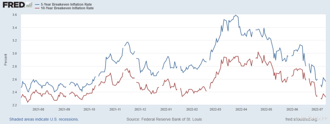 Harvey补充称:“盈亏平衡、大宗商品和消费者的趋势支持了我们的观点,即通胀将见顶。”自6月10日以来,各期限的盈亏平衡通胀率大幅下降,2年期盈亏平衡通胀率下降了100个基点以上。值得注意的是,5年和10年的盈亏平衡通胀率已经回到了一年前的水平。
