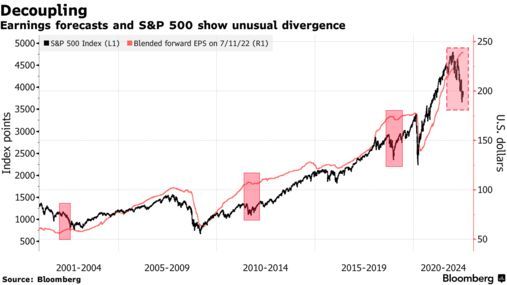 数据显示,尽管上半年标普500指数大幅下跌,但它的12个月预期盈利自年初以来已上涨7%。