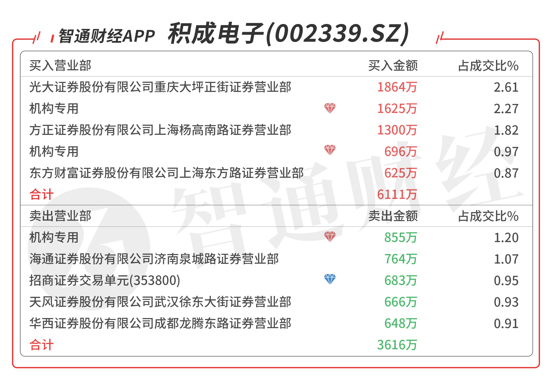 积成电子(002339.SZ):受到众多机构青睐,今日共3个机构席位出现在龙虎榜单上,合计净买入1536万元,当日净买入3121万元,该股今日反包,突破前期高点需放量。