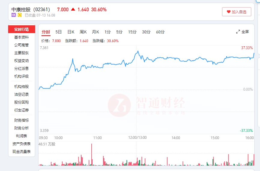 值得关注的是,中康控股(02361)首挂日(12日)平盘报收,发行价为5.36港元。上市第二日冲高,涨幅达30.6%%,报7.0港元,市值达31.50亿港元。