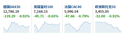 2. 截至发稿,德国DAX指数跌0.92%,英国富时100指数跌0.63%,法国CAC40指数跌0.79%,欧洲斯托克50指数跌0.92%。