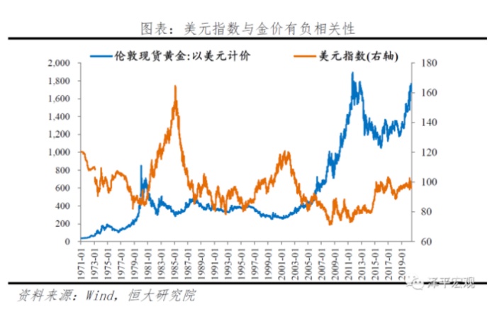 而从过去美元指数与金价呈负相关性的角度来看,美元见顶从某种程度上也可能可以说明黄金即将触底。从历史数据来看,黄金与美元指数具有一定的负相关性。