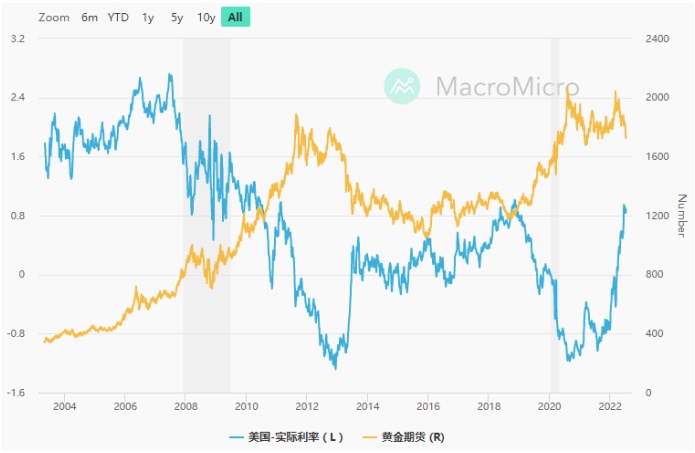 然而,如果通胀出现见顶迹象,同时衰退预期增强,美联储后期加息幅度肯定会有所放缓,甚至在衰退期间重新采取降息举措,这将使实际收益率走低,并使黄金重新走高。