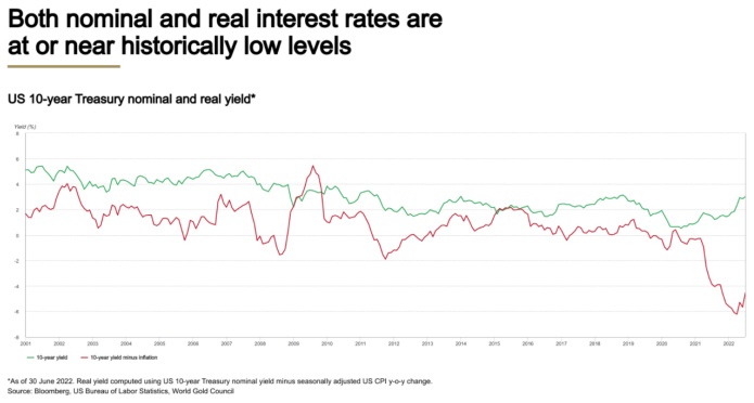 世界黄金协会WGC近日在其年中展望报告中也指出,各央行即将加息或已在加息周期中,但从历史角度来看,名义利率仍将保持低位。这对黄金来说十分关键,因为黄金的中短期表现往往会受到实际利率的影响,综合体现出黄金表现背后的两个重要驱动因素:“机会成本”以及 “风险与不确定性”。