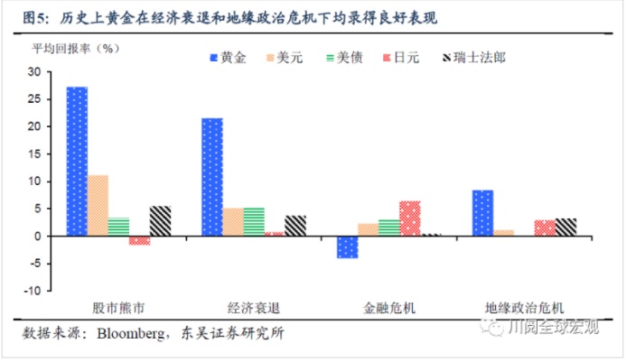 东吴证券陶川表示:“贵金属虽然二季度以来跟随基本金属跌幅扩大,但我们认为其面临的逆风正在减弱。以黄金为例,其今年的走势一直取决于通胀加剧和实际利率上行孰强孰弱,但三季度以来随着美国经济衰退风险的加大,我们认为尽管通胀压力并未明显缓解,但实际利率快速上行的阶段已经过去,并且以美国中期选举为代表的潜在的地缘政治风险仍有可能加大。从历史来看,黄金往往在美国经济衰退和地缘政治危机下表现优异,因此,我们看好金价在四季度的表现。”